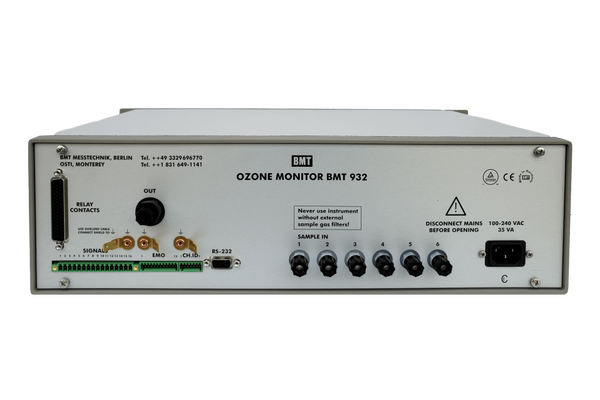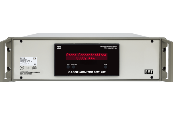 The OZONE MONITOR BMT 932 comes in a 19'' rack mount enclosure 132 x 300 mm (H x D), or in a wall mount aluminum cabinet 357 x 440 x 133 (W x H x D). This cabinet is named BMT 932 . The cabinet can be wall mounted using the four brackets provided at the rear (four mounting holes 6 mm ID, spaced 307 x 397 mm, W x H).